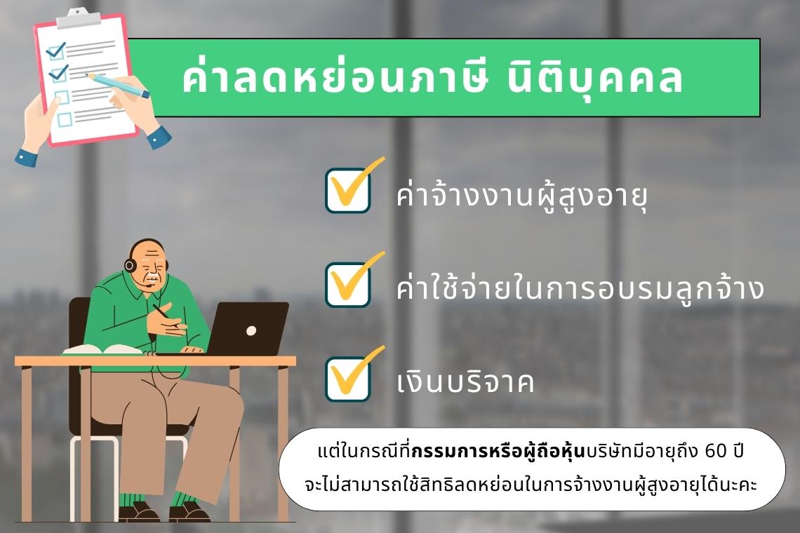 ที่จ้างงานผู้สูงอายุ โดยสามารถเอาค่าจ้างผู้สูงอายุมาเป็นรายจ่ายของนิติบุคคลได้ โดยสามารถหักเป็นรายจ่ายทางภาษีได้ถึง 2 เท่า