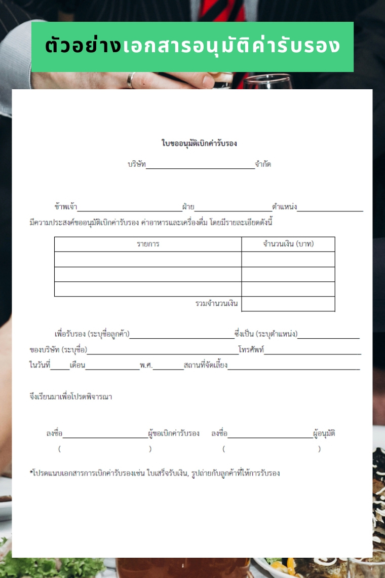 ต้องจัดทำใบขออนุมัติเบิกค่ารับรอง โดยต้องมีกรรมการ หรือผู้จัดการ หรือบุคคลที่ได้รับมอบหมายจากกิจการให้เป็นผู้มีอำนาจอนุมัติ