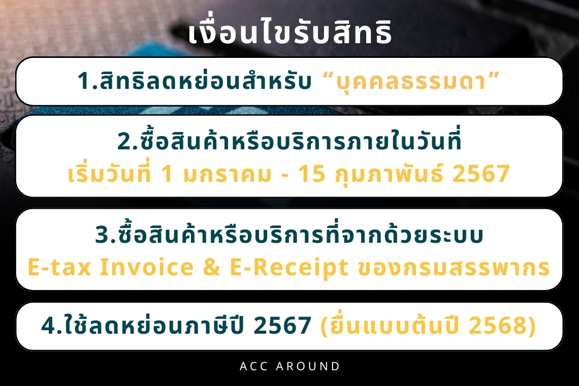 - ใช้สิทธิลดหย่อนของปี 2567 โดยยื่นแบบภาษีเงินได้บุคคลธรรมดาต้นปี 2568 และจะต้องเก็บหลักฐานในการใช้สิทธิเป็น E-Tax Invoice & E-Receipt ของกรมสรรพากร เงื่อนไขของการใช้สิทธิคือ